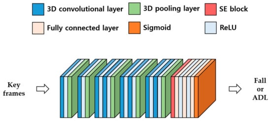 Given these problems, our proposed method extracts keyframes using the magnitudes of the optical flow vectors and detects falls with the 3D CNN with a SE block applied. By applying the SE block to one of the 3D CNN networks, namely convolutional 3D (C3D) [], and considering the important spatiotemporal information, the fall detection is carried out accurately.