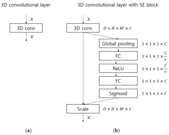 Figure 4 presents a comparison between the diagrams of the 3D convolutional layer and the 3D convolutional layer with the SE block proposed in this study. As shown in Figure 4, the 3D convolutional layer simply utilizes 3D convolutional filters, while the 3D convolutional layer with the SE block emphasizes more important channels through squeeze and excitation operations.