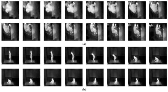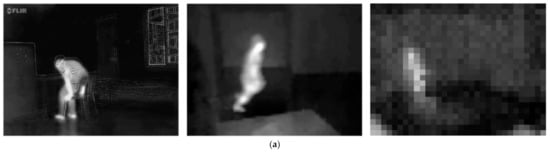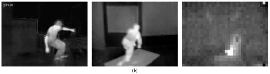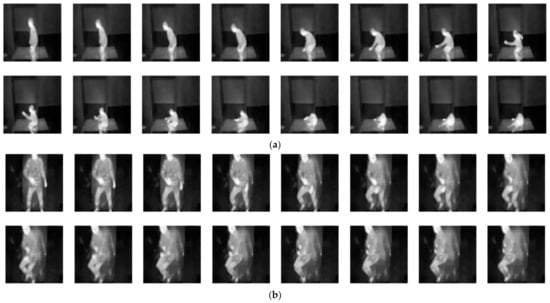 For the performance verification of the proposed method, the model performance was compared using three fall detection open datasets composed of thermal videos. The three datasets used in this study were the Thermal Simulated Fall dataset (TSF dataset) [], the Telerobotics and Control Lab fall detection dataset (TCL dataset) [], and the eHomeSenior dataset []. The TSF dataset consists of a total of 44 videos, including 35 fall videos with a 640 × 480 pixels resolution and 9 ADL videos. The TCL dataset is composed of a total of 1252 videos, including 421 fall videos with a 640 × 480 pixels resolution and 831 ADL videos. The eHomeSenior dataset consists of one dataset with a 1 8 pixels resolution and another with a 32 × 24 pixels resolution, and we chose to use the dataset with a 32 × 24 pixels resolution. A total of 448 fall accidents are included in the eHomeSenior dataset. Similar to existing studies, the frames corresponding to the fall were annotated from the videos, the other parts were regarded as ADL, and finally, they were classified into a total of 921 videos, including 448 fall videos and 473 ADL videos []. Sample images of the dataset used in this study are shown in Figure 5, and the composition of the dataset is presented in Table 2. In addition, the detailed explanations of percentages of dataset used for training and testing are shown in Table 2. For example, in case of the eHomeSenior dataset, 322 (157 + 165) (35%), 138 (67 + 71) (15%), and 461 (224 + 237) (50%) videos among a total of 921 (448 + 473) videos were used for training, validation, and testing, respectively.
