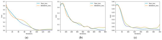 As a loss function of the proposed S3D model, the binary cross entropy loss [] was used. The kernels of the network were initialized to ‘He uniform’ [], and the bias was initialized to zero. For the model learning, the batch size was set at 16, and the adaptive moment estimation (Adam) optimizer [] was utilized. The beta values of the Adam optimizer are 0.9 and 0.999, respectively, and the epsilon value is 1 × 10−8. For the model learning, the batch size was set at 16, and the adaptive moment estimation (Adam) optimizer was utilized. The training was carried out at the learning rate of 0.0001, while at every 16th epoch, the learning rate decayed by half, and learning was performed. Figure 6 shows the training loss and validation loss graphs of the proposed method. As shown in Figure 6, the training loss graphs converged with an increasing number of iterations, and based on these results, it was identified that the proposed S3D model showed sufficient learning about the training data. Furthermore, the validation loss graphs in Figure 6 also converged with the increase of the number of iterations, and these results indicate that the S3D model was not overfitted to the training data.