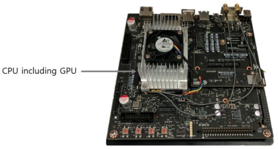 In the next experiments, the comparative processing time of the proposed method and the state-of-the-art methods were measured in the environment with a desktop computer including an NVIDIA GeForce GTX Titan X GPU and the Jetson TX2 board (NVIDIA Corp., Santa Clara, CA, USA) [] (Figure 7), as described in Section 4.1, and the results are shown in Table 16. The NVIDIA GeForce GTX Titan X GPU has 3072 CUDA cores and 12 GB memory, and the Jetson TX2 board has 256 CUDA cores, 8 GB 128-bit LPDDR4 memory, and a dual-core NVIDIA Denver 2 64-bit CPU. The power consumption of the Jetson TX2 board is less than 7.5 W. The proposed method was ported with Pytorch 1.7.1 [] in Ubuntu 18.04 OS. The versions of the installed framework and library include Python 3.8.5; NVIDIA CUDA® toolkit [] and NVIDIA CUDNN [] versions are 10.2 and 8.0, respectively.