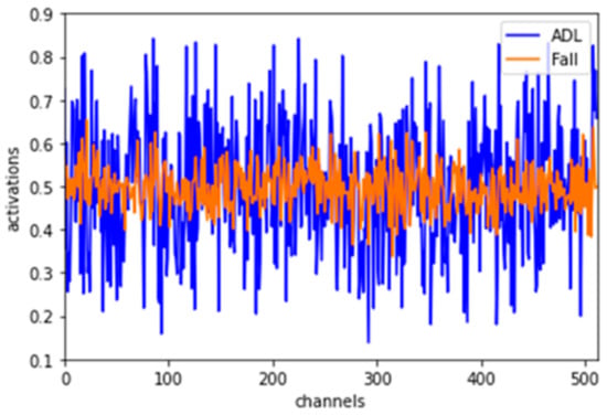 Unlike a fall, which can be defined by a few cases, such as standing and falling or sitting and falling, ADL indicates all situations except for a fall; hence, the pattern of fall videos is relatively simple, and the data diversity is low. Therefore, it can be expected that if the learned model distinguishes these characteristics of a fall video, the prediction performance will be improved. Figure 10 shows graphs of activation values by channel of the SE block in fall and ADL videos obtained during the learning of the S3D model. As shown in these graphs, the activation by channel of the fall video shows a small variation, whereas the activation by channel of the ADL video shows a relatively larger variation. Such a difference suggests that the diversity of the fall video data is relatively smaller than that of the ADL video, and the SE block identified these characteristics of the fall video well. It can be interpreted that the SE block differently applies the location and intensity of the channel emphasized in fall and ADL videos and provides important information for fall detection.
