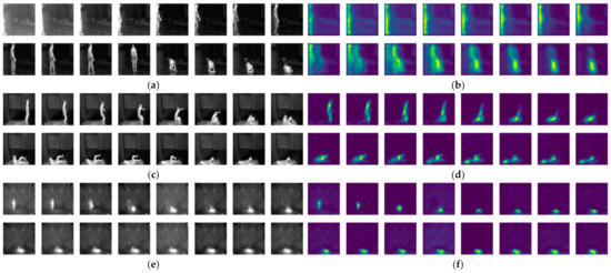 Example of activation maps. (a) Keyframes of the TSF dataset; (b) activation map results of (a); (c) keyframes of the TCL dataset; (d) activation map results of (c); (e) keyframes of the eHomeSenior dataset; (f) activation map results of (e).