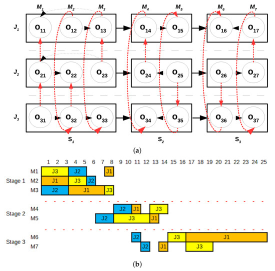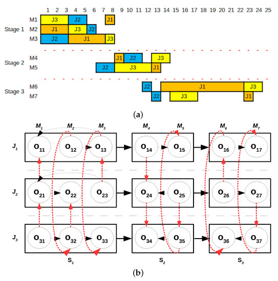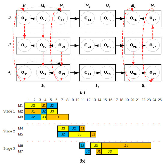 A solution to the FGSSP can be visualized through a classical disjunctive graph representation or a Gantt chart. Figure 1a provides an arbitrary solution to the example problem with , , , , where is the completion time of job j. The red dotted arcs in Figure 1a show the sequence at the machines and the black dotted arcs show the groups-permutations (i.e., the route of operations for at is , and then the route within the stage is ). A Gantt chart representation of the solution is provided in Figure 1b.