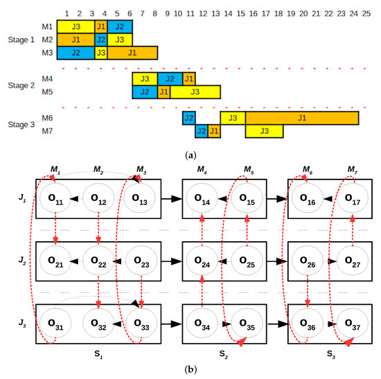 Graphical representations of a solution to the example instance provided in Table 1. (a) Gantt chart representation of an arbitrary feasible solution for the FGSSP instance presented in Table 1 with . (b) Disjunctive graph representation of an arbitrary feasible solution for the FGSSP instance presented in Table 1 with .