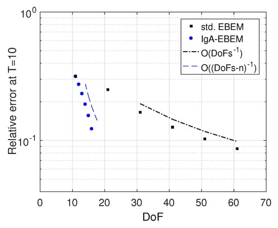 In Table 9, the relative error between the approximate transient solution at the final time instant of analysis and the limit stationary solution is reported, varying the degree of the B-spline basis, together with the space DoFs. In the same Table, the analogous results obtained by standard Energetic BEM, employing Lagrangian basis functions to represent the approximate solution, are reported: as one can see, now for the selected T, the errors stagnate for degrees higher than 3. As before, decreasing errors almost behave like .