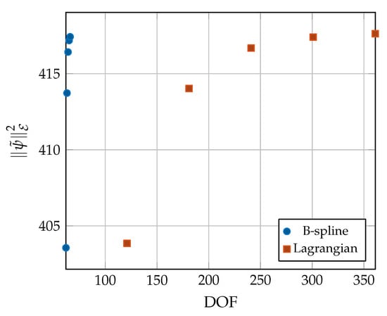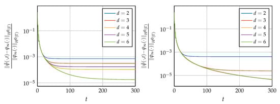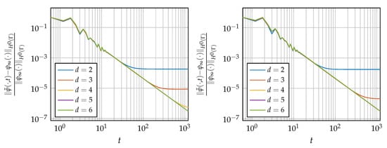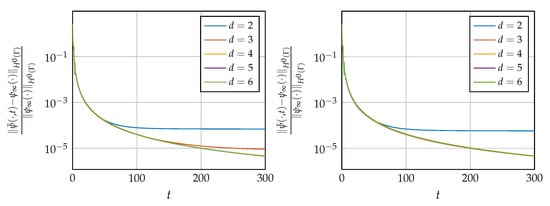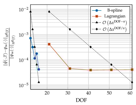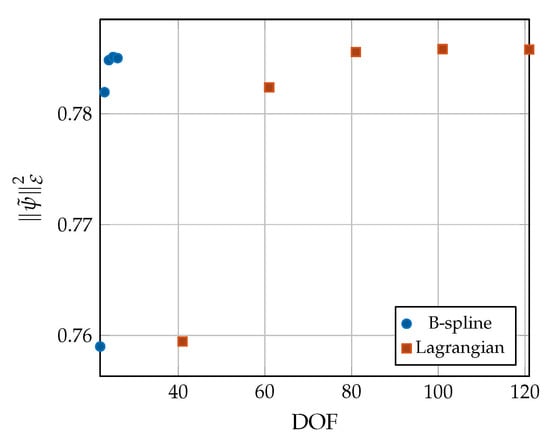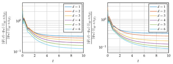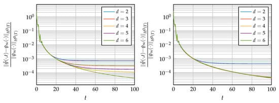 In the previous simulation, most of the approximated solutions did not reach equilibrium within the final time, as prominently suggested by the error curves in Figure 15. We therefore extend the time interval to , keeping the same discretization parameters. Figure 17 (left) shows that by time , error curves for B-spline approximations are almost flat, meaning that the equilibrium has been reached. From this time instant, the dominating error comes from the space discretization. Using Lagrangian shape functions, we can see in Figure 17 (right) the separation of the curve related to from the pack of higher-degree shape functions; the overlap of curves related to at final time suggests that here, the dominating contribution still comes from the error in time, and better approximations of the stationary solution can be achieved with even longer simulations.