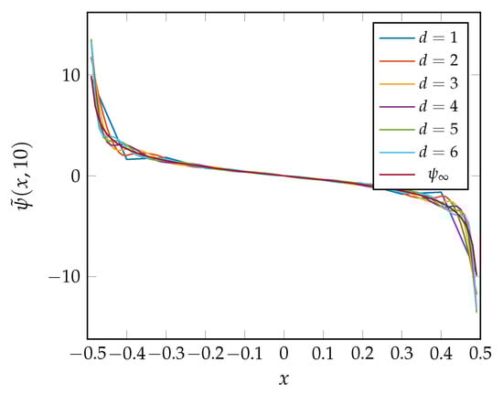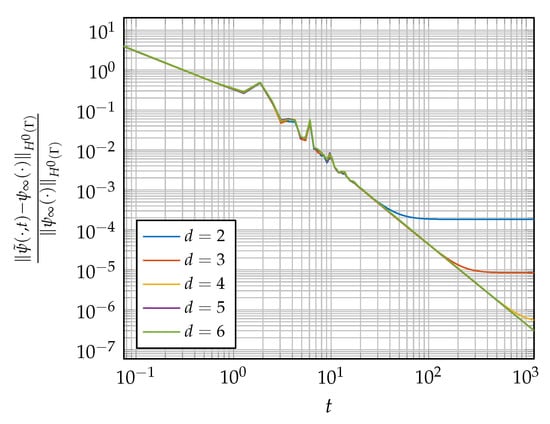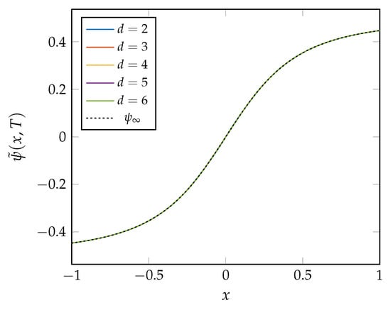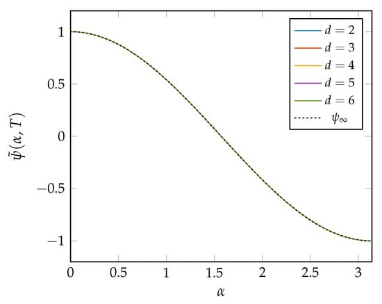 In Figure 16 we show the approximate solutions , obtained by IGA-Energetic BEM for growing values of degree d of the B-spline basis, at the final instant of analysis, . Additionally, has been reported in Figure 16 and, as one can observe, all the curves related to the approximate solutions overlap the curve related to the stationary one.