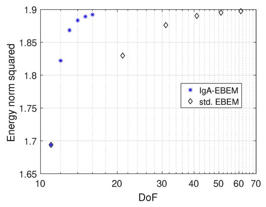Furthermore, in Table 11 the space-time energy norm squared (60) is reported for both IGA- and standard Energetic BEM, for growing degree d of the B-spline basis and diminishing time-step defined as , having fixed , together with the space DoFs. As one can observe, these values tend to stabilize towards a limit value representing the space-time energy norm of the exact solution of the BIE wave problem, but the convergence of IGA-Energetic BEM is much faster with regard to DoFs. This behavior is perfectly visible in Figure 24.