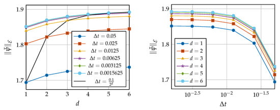To conclude, in Figure 25 (right) we can observe the expected convergence of the space-time energy norm with regard to growing B-spline degree and time-step refinement (right). As already noted in the previous examples, the main variations come from time-step refinement, due to the fact that for the given Dirichlet datum this norm takes into account the initial transient phase of the simulations.