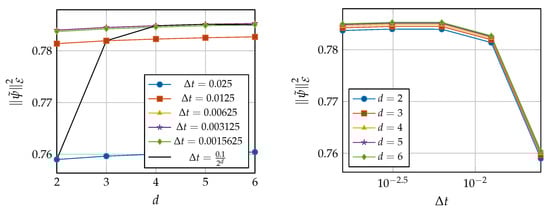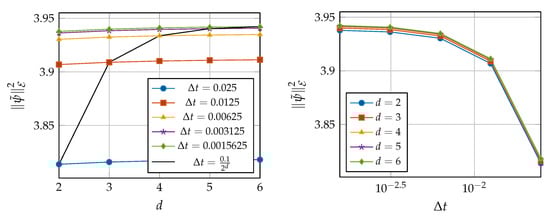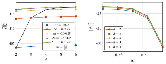 Squared space-time energy norm (60) of the approximated density on the parabola arc versus increasing B-spline degree (left) and refined time discretization (right).