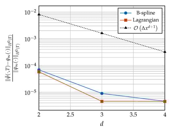 B-splines built on this refined space mesh allow for a much more accurate approximation of the stationary solution; as we can see in Figure 18 (left), the equilibrium values of the errors are significantly lower compared to those obtained on the coarse mesh. Moreover, in Figure 17 (left) all curves are flat after , leaving no room for improvement on longer simulations, while on the finer space mesh, we instead see that curves for still overlap at , meaning that the error from the space discretization will reach a lower value at equilibrium reached for longer times. Using Lagrangian shape functions, we get very similar results, visible in Figure 18 (right). Looking at Figure 19, we see that, for the degrees that reached equilibrium within final time, the convergence rate is close to the expected .