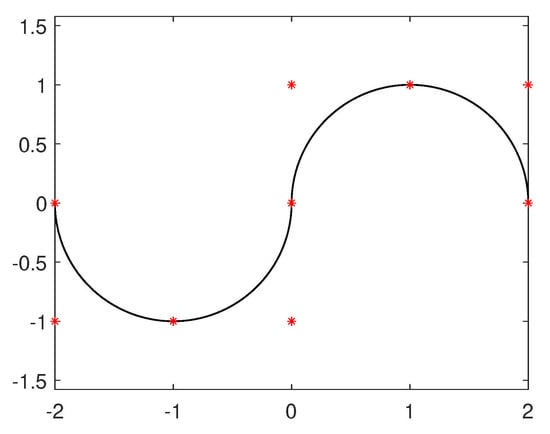 Hence, starting with the search of possible subdivision points in the outer integration variable s, let be the approximation of a subdivision point of the outer integration variable, obtained by (46), associated to an equation of the form , where is one of the inner integration extremes and is a suitable endpoint of (the symbol * denotes any index which makes the present notation consistent with the one employed above). In order to test if the approximation is good enough, we compute the residual —if it is smaller than a fixed tolerance , the approximation is accepted; otherwise, the following Newton iteration is applied: