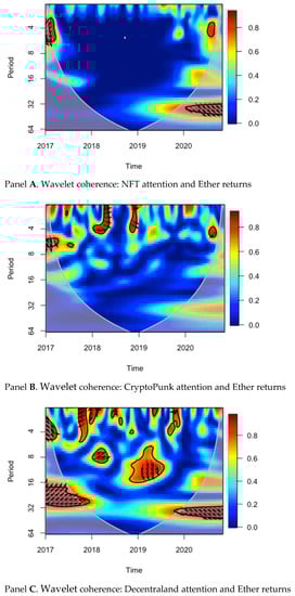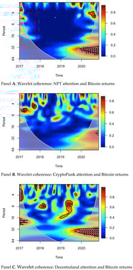 Next, we use the wavelet coherence technique to investigate co-movement between cryptocurrency returns and NFT levels of attention. Wavelet coherence analysis enables investigation of any detectable co-movement between two-time series (bivariate wavelets) in the domains of time and frequency, whereas standard time series modeling does not. Nonstationary signals can also be analyzed with wavelet coherence. Recent studies by Dowling (2021b), Goodell and Goutte (2021), and Qiao et al. (2020) [,,] employed wavelet coherence for cryptocurrency analyses.
