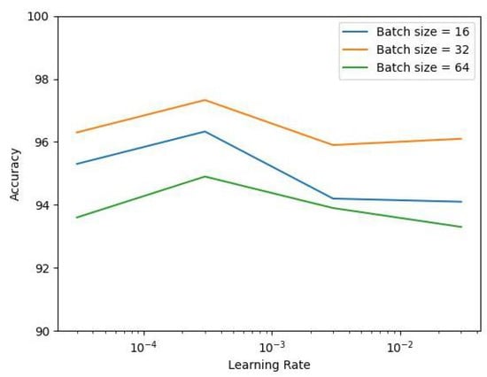 We used different NN based architectures to experiment with the proposed activation function. For the first set of experiments, we used NNs with no convolution. The experiments were conducted for single layer feed-forward networks (SLFN) as well as deeper networks with more than one layer. The values of the hyperparameters used in these experiments are mentioned in Table 1. For the hyperparameter optimization, grid search method was used. Figure 3 shows the accuracy on the MNIST dataset with a SLFN utilizing SinLU. It can be observed that, for higher and lower values of the learning rate, as well as batch size, we obtained a lower accuracy value. For the training, we used the Adam optimizer and the learning rate decreased after every two steps by an exponential learning rate scheduler. This particular setup was also used for the experiments in Section 4.1.2–Section 4.1.4.