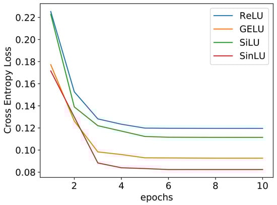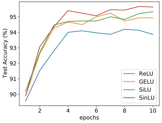 While training deep neural networks with a backpropagation algorithm, the gradient flows through the layers of the network. A gradient activation function (GAF) [] improves upon the tiny and large gradients, resulting in a better gradient flow. For this set of experiments, we used a CNN consisting of three blocks where each block was made up of two convolution layers and a maxpool layer. For the first block, the convolution layers had 32 and 64 output channels, respectively. For the second block, both of the Conv layers had an output depth of 128; for the third block, it was 256. The feature maps of dimensions 25,644, obtained from the final block, were flattened before passing through the FC layer. This network was trained with SGD and Adam optimizer with a learning rate of  for 10 epochs. GAF was utilized for both of these optimizers and the arctan GAF function was used. The hyperparameters for arctan GAF were taken as  and . The test accuracy obtained on each of the trained models is shown in Table 7. From the results, it can easily be seen that SinLU produces the best accuracy among other activation functions. The GAF helps the network to converge faster, and if we observe the results with SGD, it can be seen that the network with SinLU converges much faster than the other networks. Though for Adam, all networks perform very similar, the network with SinLU achieves the highest accuracy along with ReLU.