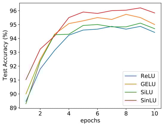 The SLFN consists of a hidden layer of size 512. Figure 4 shows the convergence graph for different activation functions. We compared the proposed SinLU activation function against ReLU, GELU, and SiLU activation functions. The SLFN utilizing SinLU gave us a training accuracy of 97.33% and test accuracy of 97.11%. Figure 4 shows the convergence of the networks with different activation functions. It can be clearly observed that, in the case of lightweight neural networks, such as SLFN, SinLU converges faster than the other activation functions. Table 2 can be referred to for an understanding of how the proposed activation function works in terms of accuracy, in comparison with other activation functions.