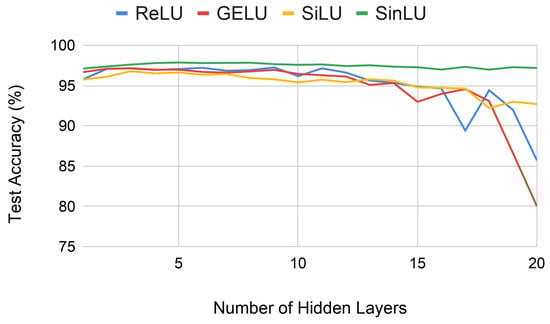 We performed the experiment to show how SinLU performs with an increasing number of layers in an NN. The size of all of the hidden layers was 512. Figure 7 shows the test accuracy on the MNIST dataset for NN models with the increasing number of hidden layers. It can be observed that the models utilizing ReLU and GELU began to overfit heavily as soon as the number of hidden layers reached 15. All of the activation functions, except SinLU, performed poorly with models getting deeper. It can be observed that, even if the NN model got deeper, the proposed activation function performed almost the same. There was not even a small amount of reduction in test accuracy for SinLU as the number hidden layers became 20. It is very likely that this high resistance to overfitting comes from the better gradient flow of SinLU during backpropagation. It was already mentioned that the shape of SinLU helps in overcoming the gradient-related problems, such as vanishing gradient, and dying ReLU problems, and this property helps the parameters of the deeper NNs to learn better.