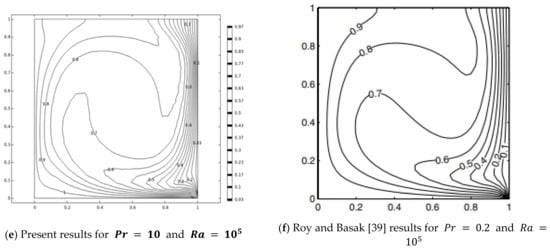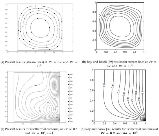 The credibility of currently conducted computations is assured by comparing with the work published by Roy and Basak []. For agreement of the present simulations, restriction of physical parameters is made where . Graphical results for velocity stream lines and isothermal contours against Prandtl number and Rayleigh number are sketched. From graphical structures total agreement is accomplished. In addition, tabular values of average Nusselt number against (n) are compared with previous work published by Khezzar et al. [] and Sojoudi et al. []. From the data it is also depicted that the average Nusselt number magnitudes are in complete agreement with each other.
