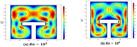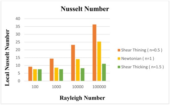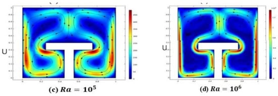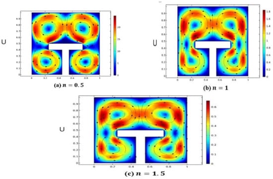 Results were interpreted by executing the finite element approach via COMSOL Multiphysics software regarding heat transfer attributes of power-law fluid enclosed in a square enclosure including the fitting of a T-shape fin. Deviation in velocity and temperature distribution against different magnitudes of involved parameters like Rayleigh number , power-law index and Prandtl number . In addition, local and average heat transfer rates and kinetic energy measurements are enumerated against sundry variables. Variation in the Nusselt number and kinetic energy against the power-law index is represented in Table 2. It is evaluated that by increasing , local heat transfer and kinetic energy depreciate because of the fact that by increasing the power-law index fluid behavior changes from shear thinning to thickening. So, as an output fluid viscosity increments slow down the motion and heat transferring process from the flow domain. Deviation in local Nusselt number and kinetic energy against is evaluated in the form of line charts and is represented in Figure 3, Figure 4 and Figure 5. It is manifested from these sketches that by increasing the local Nusselt number as well as kinetic energy decreases because of the fact that by increasing the fluid’s viscosity enriches and causes a reduction in the movement of particles and heat transfer within the flow domain. Table 3 demonstrates the behavior of the Nusselt number against and by specifying , and . The increasing trend in the Nusselt number is depicted against the Rayleigh number , whereas it is also disclosed that the magnitude of the Nusselt number is greater in the shear thinning case, i.e., , than This behavior is evidenced by the fact that an increment in increases thermal buoyancy forces due to which heat is transferred within the flow domain from one part of the enclosure to the other. Table 4 exhibits the change in kinetic energy against , fixing By increasing ranging from kinetic energy increments abruptly. This is because of the fact that by varying molecular diffusion occurs quickly due to temperature difference and hence the global quantity shows elevation. In addition, the magnitude of the kinetic energy for compared to and is scrutinized. Figure 6a–c represents the impact power law index on velocity distribution in the form of stream lines. The velocity profile for ) showing the pseudo-plastic manner of the power-law fluid model is addressed in Figure 6a. The compact circular patterns in the flow field are noticed showing less dominating aspects of viscosity over inertial forces. Subsequently, it is found that fluid particles move with more speed and are dispersed in the form of circular motion around the fin. In Figure 6b,c elliptic shaped deformation zones are produced on all sides of the fin, which represents the dominating effect of viscous forces instead of thermal buoyancy forces. So, from these sketches it is revealed that at a lower magnitude of , shear stresses generated due to viscous forces are impressive compared to the higher values of Figure 7a–c describes momentum distribution against , ranging from . Intensification in stream line formation around the T-shaped fin is found. This is because of the fact that by increasing , dominance in the diffusion of particles takes place within the flow, which as an outcome raises the formation of the pattern around the fin. Figure 8a–d displays the behavior of temperature distribution against the increasing value of due to the provision of uniform heating at the fin. It is seen from the corresponding figures that by increasing the magnitude of , sharpness in the temperature profile is produced due to the enrichment in thermal driven buoyancy forces. In addition, it is worthwhile to mention that heat diffuses more quickly for higher magnitudes of Figure 9 expresses the comparative analysis between the average and local Nusselt numbers against flow behavior index and . It is manifested that by increasing (n) and (Pr) the magnitude of local heat flux generated by the provision of uniform heating is extensive compared to the measurement of the average Nusselt number within the whole domain. Here, it is also measured that, by increasing (Pr), the Nusselt number is enhanced because the momentum of the fluid raises compared to the thermal diffusion, whereas contrary behavior in the heat flux against (n) is communicated for both local and average Nusselt numbers. Variation in kinetic energy against and for different values by drawing a cutline at is displayed in Figure 10. It is scrutinized that the magnitude of kinetic energy for n = 0.5 against variation in (Ra) is comparatively higher than for and ). In addition, it is illustrated that for (Ra = 0), kinetic approaches to zero due to the absence of temperature difference within the enclosure. Variation in kinetic is given in Table 5.