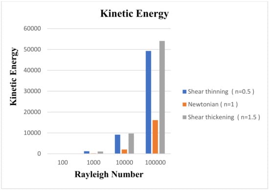 - The magnitude of kinetic energy and Nusselt number for shear thinning fluid is comparatively higher than for shear thickening and Newtonian cases.