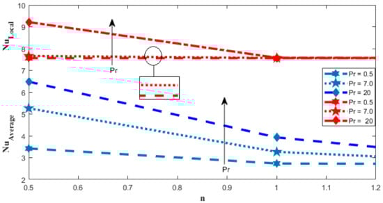 Variation in Nusselt number against (Pr) and (n).