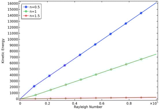 Variation in kinetic energy against (Ra) and (n) at X = 0.5.