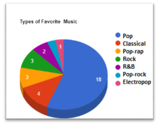 Music preferences are very personalized and culturally diverse. Everyone has his/her favorites when it comes to music. Music of different genres can vary considerably in melodic and choral features and rhythmic complexity. Memories and thoughts can be interlinked with favorite music and can be evoked by listening to that music regardless of the genre of the music [27]. The response of individuals may differ to the same kind of music. For example, classical music may help some people to feel calm and relaxed, while others may feel differently. In this experiment, the subjects were free to choose their favorite music, and the distribution of the genre of the selected music is shown in Figure 1.