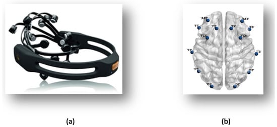 (a) Emotiv Epoc headset; (b) position of EEG electrodes on the human scalp.