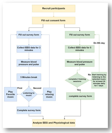In the study of the short duration, the baseline EEG signals of the subjects were recorded for 3 min before listening to the music. After a 5-min break, the subject listened to his/her favorite music while another 3-min round of EEG signals was recorded. Again, after a 5-min break, the subject listened to relaxing music while another 3-min round of EEG signals was recorded. Figure 3 shows the flow diagram of the study of short- and long-duration studies.