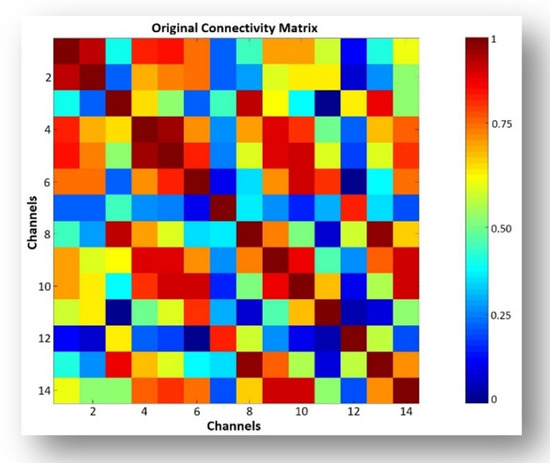The connectivity matrix for real EEG data is shown in Figure 4. As the FC is undirected, the matrix is always mirrored about the diagonal, and the diagonal is always 1. The number of paired electrodes is calculated using Equation (2):