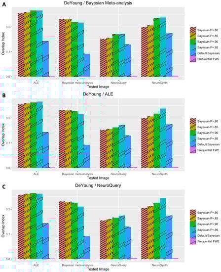 Performance evaluation with DeYoung et al.’s (2009) dataset. (A) Analysis results when image-based meta-analysis was used for prior determination. (B) Analysis results when coordinate-based meta-analysis with BrainMap and Ginger ALE was used for prior determination. (C) Analysis results when coordinate-based meta-analysis with NeuroQuery was used for prior determination.