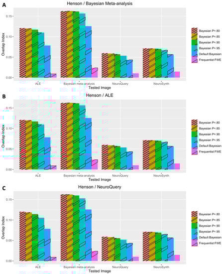 Performance evaluation with Henson et al.’s (2002) dataset. (A) Analysis results when image-based meta-analysis was used for prior determination. (B) Analysis results when coordinate-based meta-analysis with BrainMap and Ginger ALE was used for prior determination. (C) Analysis results when coordinate-based meta-analysis with NeuroQuery was used for prior determination.