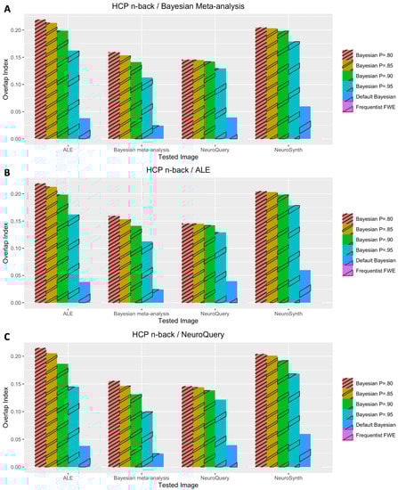 The performance outcomes from all the voxelwise second-level analyses, in terms of Iovl, are presented in Figure 2, Figure 3, Figure 4, Figure 5 and Figure 6. The results are presented for each dataset, each type of meta-analysis used for prior determination, and each analysis type. In Figure 2, Figure 3 and Figure 4, the results of the analyses of three working memory datasets, DeYoung et al. (2009), Henson et al. (2002), and Pinho et al. (2020), respectively, are presented. In these cases, three subplots report results from Bayesian analyses with prior distributions determined by image-based meta-analysis (Figure 2A, Figure 3A and Figure 4A), BrainMap and Ginger ALE (Figure 2B, Figure 3B and Figure 4B), and NeuroQuery (Figure 2C, Figure 3C and Figure 4C), respectively. In Figure 5A,B, the results from the analyses of Pinho et al.’s (2020) speech dataset are presented. The results of the analyses of Gordon et al.’s (2017) face dataset are demonstrated in Figure 6. In the analyses of these two datasets, two different information sources, BrainMap and Ginger ALE (Figure 6A), and NeuroQuery (Figure 6B), were employed for prior determination.