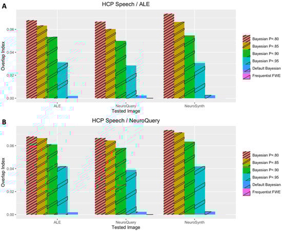 Performance evaluation with Pinho et al.’s (2020) speech dataset. (A) Analysis results when coordinate-based meta-analysis with BrainMap and Ginger ALE was used for prior determination. (B) Analysis results when coordinate-based meta-analysis with NeuroQuery was used for prior determination.