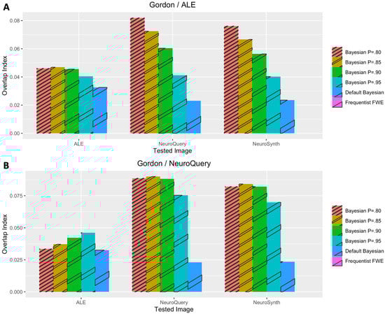Performance evaluation with Gordon et al.’s (2017) dataset. (A) Analysis results when coordinate-based meta-analysis with BrainMap and Ginger ALE was used for prior determination. (B) Analysis results when coordinate-based meta-analysis with NeuroQuery was used for prior determination.