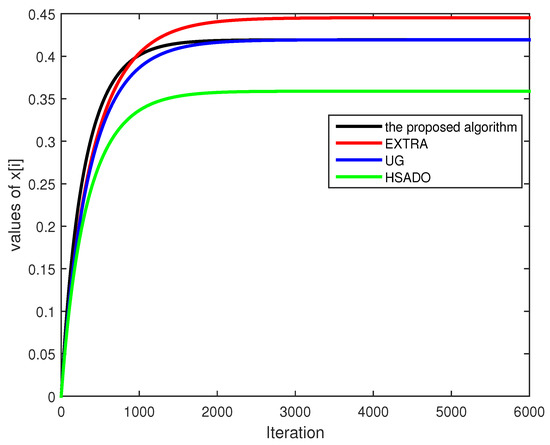 - Figure 1 indicates that the proposed algorithm UGNH promotes the convergence rate compared to the related algorithms in the real dataset; thus, UGNH is effective and superior. From Figure 2, the sequences generated by UGNH, EXTRA, UG, and HSADO can converge to the optimal solutions as expected. Avoiding confusion of the figure, only one dimension of each decision variable is exhibited.