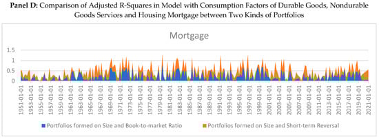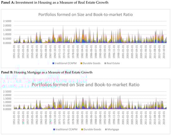 It has been proved that illiquidity and fluctuations in real estate value, which is undoubtedly the largest share of household portfolios, can increase consumption risk and trigger financial crisis (Huh and Kim, 2021 [34]; Eiling et al., 2019 [35]; Liu et al., 2013 [36]). Learning from the history of American financial crisis, we find that changes in the real estate have an indelible effect on the US financial market. In order to comprehensively understand the effects of real estate on financial market, we run the regression in these two kinds of portfolios with CCAPM containing different factors.