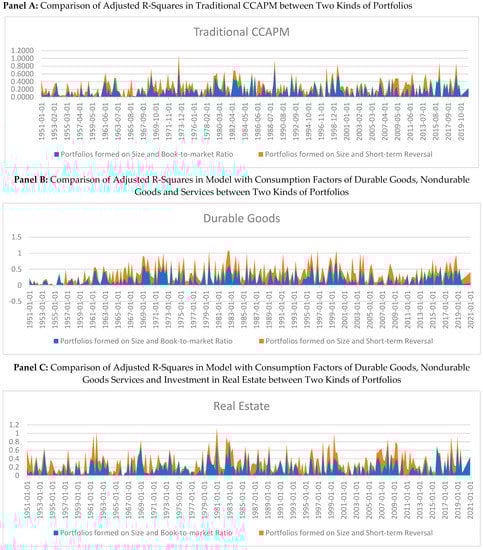 Meanwhile learning from Panel A in Figure 3, we find that in traditional CCAPM, the values of adjusted R-square are roughly greater by using the portfolios formed on size and book-to-market ratio than ones based on size and short-term reversal. Furthermore, as more consumption elements are added, this trend keeps on. Thus, the formation of stock portfolios also plays a significant role in the model.