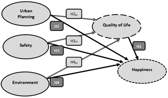 Analysing the influence of different types of factors on happiness and quality of life requires the use of a multidimensional approach. This allows us to include a wide range of factors, considering both the direct effect of each factor on happiness and the indirect effect mediated by quality of life. In this respect, there are a number of studies that explore the influence of different economic/labour-related factors on happiness; notable examples focus on income [2,3,15,36,41,43,44,45,46,47], or employment status and access to housing [15,44]. However, other studies account for aspects related to the city of residence, such as population density or travel times on public transport [15] or the size of the city [48,49]. For example, accessibility and transportation play an important role in obtaining a good quality of life [49]. However, according to our background, there are no studies that focus on citizens’ subjective assessment of the particular features of their city. In this regard, we consider assessments of urban planning, the environment and safety, and the extent to which quality of life acts as a mediating variable on their influence.