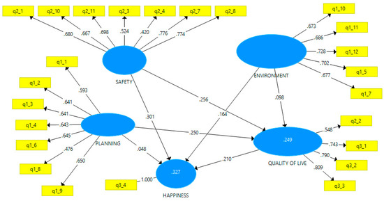 The most relevant prerequisite for the evaluation of the structural model is the evaluation of the quality of the model [85]. For the R2 values have also been taken into account: good results in terms of predictive power are obtained for quality of life (0.249) and for happiness (0.327) [86].