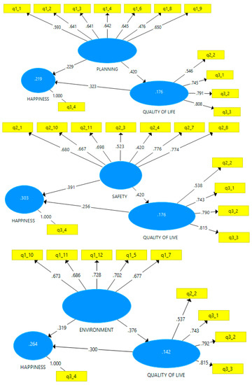The main results for direct and mediating effects are summarised in Table 5. Again, it can be seen that the so-called direct effects are positive and significant (β = 0.229; β = 0.391; β = 0.319; p < 0.001); that is, urban planning, the environment and safety in cities have a positive influence on the happiness of European cities’ residents. The significance of these factors had already been confirmed with the first hypotheses tested (H2, H3 and H4), and they were even ranked according to their value.