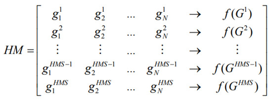 | 1: for i = 1 to the maximum number of iterations (NI) 2: = empty 3: for j = 1 to number of decision variables 4: r1 = uniform random number between [0, 1] 5: if (r1 < HMCR) 6: = randomly selected from QHM j 7: else 8: = randomly generated from DHM (with probability 1 − HMCR) j 9: r2 = uniform random number between [0, 1] 10: if (r2 < PAR) 11: pitch adjusted mutate g i j 12: else 13: do not change the decision variable value 14: end if 15: end if 16: Add to HM 17: end for j 18: end for i |