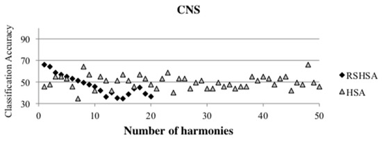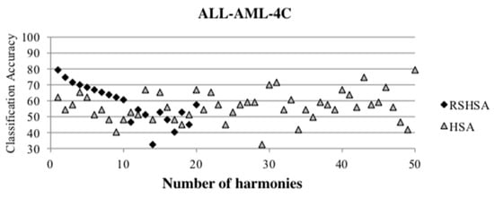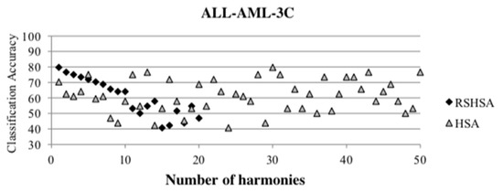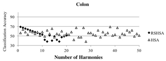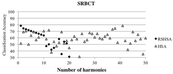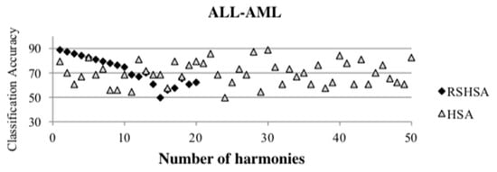 With reference to the outcome in Table 10, it is evident that the SU-RSHSA outperforms the RSHSA in terms of accuracy of classification in all datasets. The SU-RSHSA also outperforms the RSHSA on seven datasets with regards to the number of selected genes. It again appears that the significant improvement achieved by the SU-RSHSA compared with the RSHSA, i.e., finding small subsets of genes with high accuracy of classification, is due to the utilization of SU for choosing the most effective gene (based on the evaluation of SU) when initializing the HM. This finding shows that the method that combines the filter with the wrapper in one method can achieve very good outcomes compared to the wrapper approach alone.