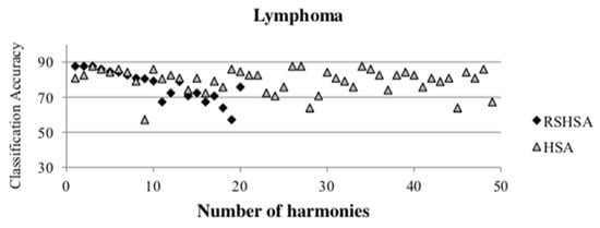 Solution distributions for Lymphoma based on the Harmony Search Algorithm and the Reference Set Harmony Search Algorithm.