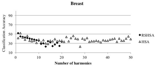 Solution distributions for Breast based on the Harmony Search Algorithm and the Reference Set Harmony Search Algorithm.
