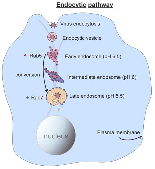 A schematic illustration of the endocytic pathway: a virus entering the cell via endocytosis is transported inside the endocytic vesicle and early endosomes towards intermediate and late endosomes. The acidification of endosomes and the pH-dependent release of viral genetic material into the cytoplasm after the late endosome’s membrane rupture are mediated by the conversion of Rab5/Rab7 proteins on the endosome surface.