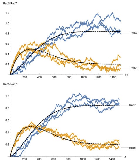 We should emphasize that the linearization of nonlinear equations [18] for Rab5 and Rab7 facilitates analytical approaches to solutions without sacrificing the qualitative model behavior. For example, without the noise, Equation (1) can be solved analytically (see the Appendix A). Incorporating nonlinear kinetic terms may introduce problems such as hyper-parameter tuning and greater sensitivity, which make stochastic numerical algorithms difficult to verify. Exploring these non-linearities and their interaction with noise terms would be the subject of future studies.