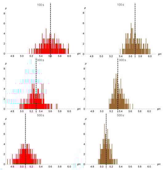 Histograms for (Equation (13)) after numerical integration of Equations (1), (2) and (9) for Poisson (left panels) and Gaussian (right panels) noises with the parameters presented in Figure 2. Rows show the distribution of pH values calculated at different times s, s, and s. Dashed lines show the mean values.
