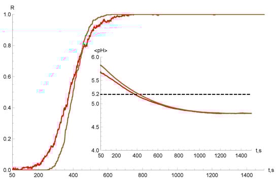 In Figure 4 we compare the time dependence of the fraction of endosomes with pH and the time behavior of the average <pH>. For times s, for Poisson noise is greater than for Gaussian noise. At s, approaches ≃ 0.9–0.95 for Poisson noise and Gaussian noise. We found that compared to Gaussian noise, Poisson noise produces more heterogeneous times of viruses pH-triggered escape out of endosomes especially at small time ( s). This is in qualitative agreement with the experimental observation of the variability of escape times of Dengue virus. Therefore, we suggest that Poisson noise is more realistic for stochastic modeling of virus–endosome fusion and endosomal escape.
